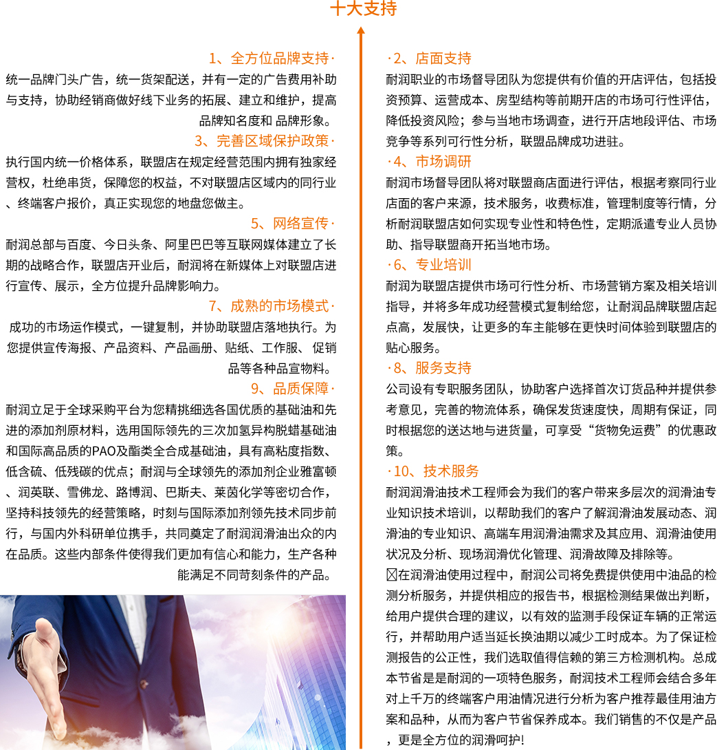 4、耐潤潤滑油將提供包括員工培訓(xùn)、店面形象設(shè)計、廣告策劃、品牌推廣、產(chǎn)品更新等加盟支持。