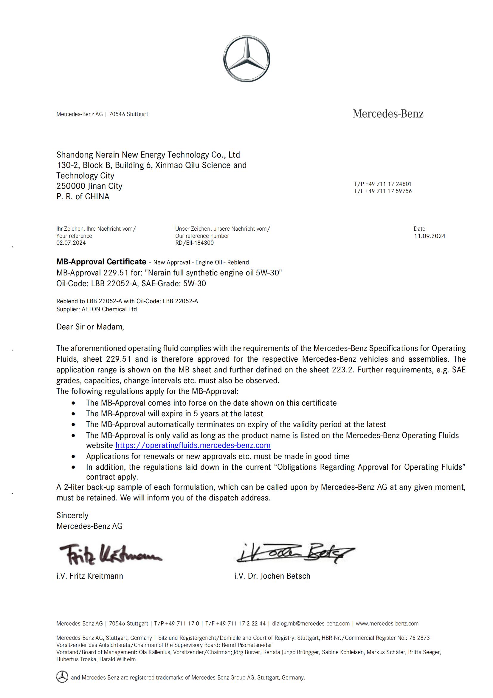 奔馳MB-229.51標(biāo)準(zhǔn)認(rèn)證