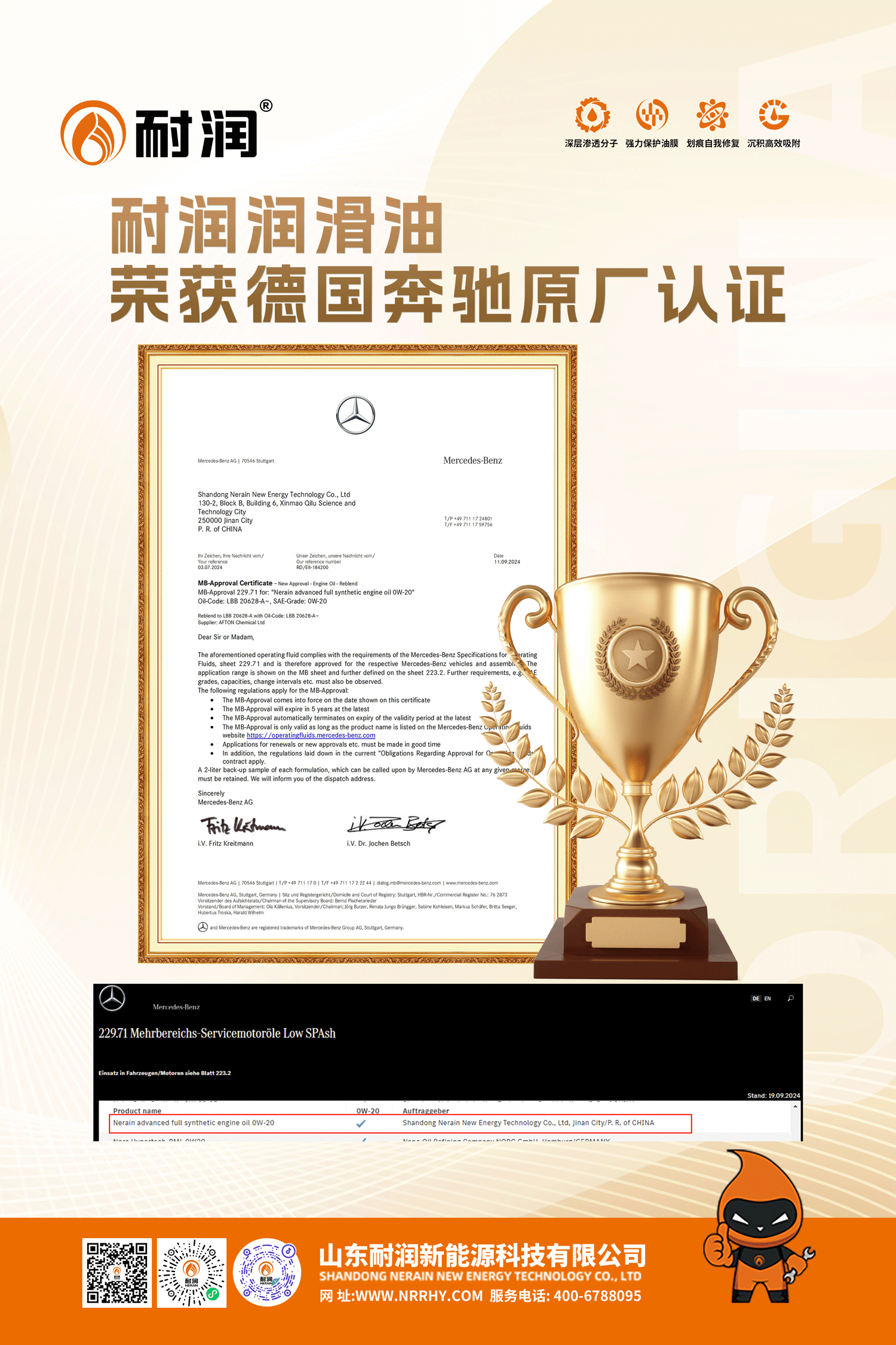 近日,耐潤(rùn)潤(rùn)滑油產(chǎn)品榮獲德國(guó)梅賽德斯·奔馳MB-229.71標(biāo)準(zhǔn)認(rèn)證,這標(biāo)志著耐潤(rùn)產(chǎn)品受到了世界權(quán)威汽車(chē)制造商的認(rèn)可,不僅進(jìn)一步證明了耐潤(rùn)潤(rùn)滑油產(chǎn)品在質(zhì)量和性能方面的卓越表現(xiàn),也體現(xiàn)了其在潤(rùn)滑油市場(chǎng)上的競(jìng)爭(zhēng)實(shí)力。